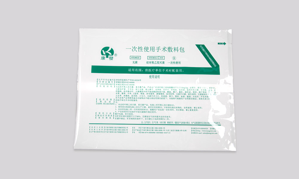 [性能結構] 本品經環氧乙烷滅菌,系無菌產品;產品出廠時其環氧乙烷殘留量應不大于10mg/kg;由洞巾、洞巾(小)、手術巾、無菌保護罩、手術衣、病人衣服、病人褲子、潔凈袋、治療巾、紗布塊、標本袋、醫用外科口罩、手術帽、腳套、外科縫線、醫用縫合針、滅菌橡膠外科手套或橡膠檢查手套、腰盤、鑷子、量杯、塑料盆、棉球、碘伏棉球、棉簽、注水筒、腹帶、中單、U型單、棉墊、紗布繃帶、酒精棉球、醫用膠帶、無菌手術膜、彈性繃帶、無菌塑柄手術刀、捆扎止血帶、消毒刷、醫用鉗、小毛巾、無菌手術刀片、積液袋、剪刀、圍單、袖套、腿套、內包布、外包布組成。在不改變產品預期用途及內裝物品不超出規定范圍的前提下,內裝物可根據用戶合同要求確定。規格允差±8%。